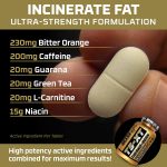 Micro-Crystaline Cellulose, Caffeine Anhydrous, Bitter Orange (Citrus Aurantium), Niacin (Vitamin B3), Silicon Dioxide, N-Acetyl-L-Carnitine, Magnesium Stearate, Green Tea Extract 4:1, Guarana Extract 4:1. |